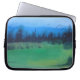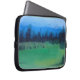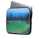 Deze unieke laptophoes bevat een sectie die is overgenomen van een origineel landschapsschilderij dat erop is gedrukt. Het afbeelding van het spookeboslandschap in de winter beslaat het hele sleeve. Het kleurrijke kleine landschap is een origineel schilderij van de waterverf, in de kleuren groen en blauw. In de lucht zie je een paar vogels vliegen boven het silhouet van de bomen. Dit originele afbeelding van de bosbouw staat echt op deze originele laptophoes.