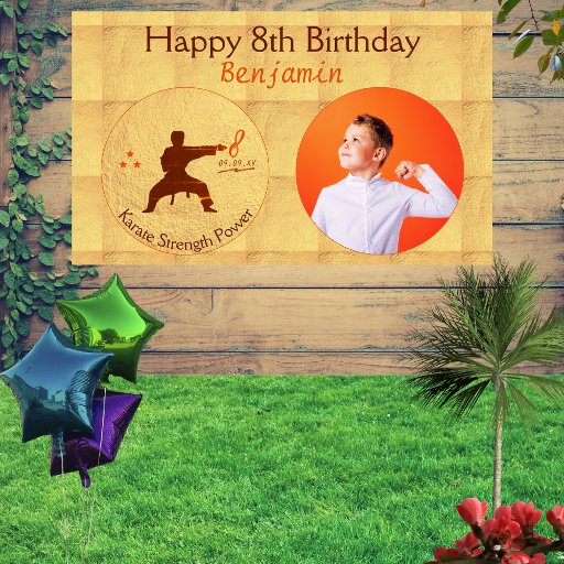 De kracht van vechtsporten in een modern karate silhouet ontwerp op een gouden achtergrond symboliseert karate gouden medailles. Personaliseer de leeftijd van de jarige en maak gewoon plezier met familie en vrienden.