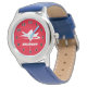 Cool jet fighter kind horloge met aangepaste jongensnaam. Gepersonaliseerde polshorloges voor jongens. Leuk vakantie- of verjaardagscadeau-idee voor zoon, kleinzoon, neef, neef, neef, kinderen enz. Blauw en rood wijzerplaatontwerp met vliegtuig en slimme typografie. Diameter rond 33 mm. Blauwe of gekleurde lederen band. Waterbestendig tot 3 bar. Geschikt voor leeftijd vier tot twaalf jaar. Luchtvaart thema cadeau ideeën.