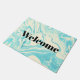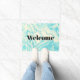 Een stijlvolle en gesofisticeerde welkome vlek met een elegant faux marmer patroon met draaiende kleuren in turkooisblauw en roomkleuren. Welkom, geschreven in een groot vet lettertype.