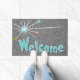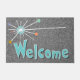 24 "x36" Mid-Century Deurmat met grote blauwgroen "WELKOM" in retro lettertype op grijze grafische achtergrond. Inclusief gestileerde starburst. Geweldig voor uw mid-Century home entry manier.