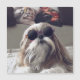 Het idee van een cadeautje voor leuke hondenliefhebbers aanpassen en personaliseren. Vreemd schattig, bruin vrouw hond met grote zwarte neus, lang haar en grove oude schoolkleurige zonnebril op haar hoofd. Cool Shih Tzu die op de bank liegt en koelt en zich als een pro voor een portret uitwerpt.