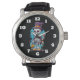 Een horloge met een illustratie van een humoristisch skelet. Het dragen van een hoge hoed, het houden van een drink. Hij heeft een grote glimlach op zijn gezicht. Leuk en spookachtig plezier voor Halloween.