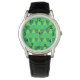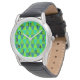 Dit man horloge heeft een Bauhaus-ontwerp van het herhalen van trapezoïden in tinten blauw en groen.