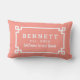 Het stijlvolle lumbale kussen is voorzien van een wit Grieks, geometrisch grensontwerp en een monogram dat gepersonaliseerd kan worden met een getrouwde of familienaam, een datum die is vastgesteld voor het jaar dat het lijst is gehuwd of het jaar dat het eerste kind is geboren. Pas het koraal oranje/roze achtergrond aan om met uw openluchtdecor te coördineren.