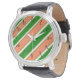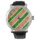 Dit horloge met koraal en groene diagonale strepen maakt een gewaagde mode statement.