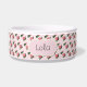 wit keramisch petgerecht, met een roze en witte polka dot band, met roze rozen, rondom de kom. Een roze decoratief tekstgebied, aan de voorzijde van de kom, heeft zwarte aangepaste tekst klaar om te personaliseren voor uw bont baby.