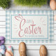 Deze schattige paasdeurmat heeft een uitgesproken landelijke sfeer met een blauw en wit gingham gecontroleerd achtergrondpatroon dat het "Happy Easter" blauwe en roze retro decoratieve script aanvult dat is versierd met een schattig paar konijnenoren op de top van de 'E' in Pasen. Personaliseer door uw familienaam toe te voegen.