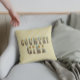 Leuk werpkussen met landelijk thema heeft tekst in funky western lettertype met luipaard en zonnebloemvulling op een gingham-achtergrond.