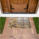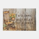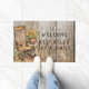 Prachtige deurmat met een rustieke houten achtergrond en een comfortabele, houten country schommelstoel met mooie zomerbloempotten. "Welkom, Rust, Ontspan, Blijf Even" kan naar wens worden aangepast.