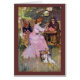 Een paar zitten buiten voor een knutseltafel onder papieren lantaarns. De dame draagt een roze jurk met haar haar haar, en gooit thee voor de man die zijn rietrietje en wandelstok onder de tafel heeft gestookt. Er is een klein vouwstout met het vrouwenboek en paraplu ertegen gepropt. Een illustratie uit een tijdschrift uit 1908.