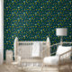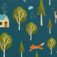 A whimsical forest-themed pattern featuring trees, foxes, rabbits, a deer, and a cozy cabin, set against a deep teal background. Perfect for nature lovers.