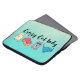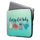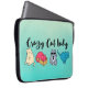 Een laptophoes met de woorden "Crazy Cat Lady" in een trendy lettertype. 4 schattige katten onder de tekst. Elke kat heeft een unieke persoonlijkheid. Een is een coole kat met zonnebrillen en een stropdas, een andere is een slapende kat, een staring kat, en een is een speelse kat in een doos die er klaar voor is om te springen. Reeks op een groene kleur achtergrond.