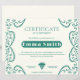 Featuring a sophisticated cream background adorned with intricate teal green floral swirls and vine borders, this certificate offers a timeless and organic aesthetic. The design includes a classic shield emblem with a star at the bottom and a bold, modern rounded box for the recipient's name (shown as "Emma Smith"), ensuring the honoree stands out.
