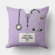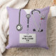 Uniek kussenontwerp voor verpleegsters met ziekenhuiskledij, een stethoscoop en een Zwitsers zakmes. Pas tekst aan om naam en professionele kwalificaties toe te voegen.