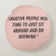 Een gooi rond kussen met een geestig citaat "Creatieve mensen hebben gewoon tijd nodig om rond te zitten en er niets op geschreven te doen" in zwarte kleur op een schaduw van lichtroze geschreven op de voorkant en eenvoudig roze aan de achterkant.