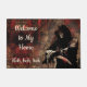 Creepy Grim Reaper afbeelding op bloedige achtergrond met de woorden "Welkom in mijn huis. Heh, heh, heh..." in een middeleeuws beige lettertype.