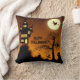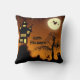 Een angstaanjagend spookhuis op de top van een heuvel met een grafveld tegen een duistere oranje lucht. Er is een volle maan met een boze heks die er overheen vliegt. Zeer leuk en eng ontwerp voor uw Halloween decoratieve gooi kussen.