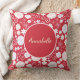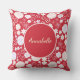 Cream en rode bloemen in een oog die floreel patroon met ruimte voor een naam van andere douanetekst vangen indien gewenst. Dit prachtige bloemenontwerp is verfijnd elegant en prachtig stuk. Het bloempatroon bestaat uit variaties van veel bloemen, zowel klein als groot, heel veel bladen, of slechts een paar, scherp afgebeelde bladen of rond. De achtergrondkleur van deze bloemkussen is een donker rood. De ruimte om uw eigen naam toe te voegen is in een cirkel. Het bloemontwerp wordt herhaald op zowel de voorzijde als de achterzijde.