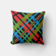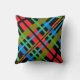 Deze vrolijke gooiende kussen tonen een kleurrijk abstract patroon van kromme lijnen in rood, oranje, groen, geel, blauw en zwart op een zwarte achtergrond. Het afbeelding wordt op de achterkant herhaald.