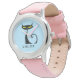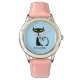 Dit gepersonaliseerde roestvrijstalen roze horlogeontwerp is voorzien van een retro mid-eeuwse moderne "atomaire" zwarte kat met grote gele ogen en een krullende staart. U kunt de spelling van de tekst eenvoudig wijzigen; lettertypestijl, -kleur en -grootte met de Zazzle Personalize-knop.