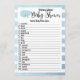 Lichtblauwe en witte waterverf gestripte achtergrond, een baby die onder de douche staat te vieren. Stomme, lichtblauwe walvis met witte riem op de achtergrond net onder de tekst "baby shower". Honoree naam sjabloon gemaakt voor jou op deze Dierennaam Game, met 20 namen van dieren en je gasten kunnen raden wat de baby van elk dier wordt genoemd. *Op verzoek is een antwoordenlijstformulier beschikbaar. Ik kan je een kopie sturen.*