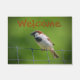 Deze deurmat is voorzien van een zoete kleine vogel die op een hek rust in een tuin in Connecticut.