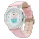 Een horloge met een lichtblauw en wit gestreepte patroon voorzien van een blauw en roze puntpatroon. Lagen over de bovenkant is een schattige blauwe cupcake met roze vorst en een kawaii glimlachend gezicht. Een kersen bovenaan heeft ook een schattig gezicht. Een vallende ster vliegt in de lucht