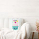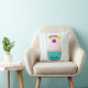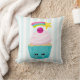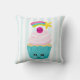 Een kussen met een lichtblauwe en witte gestreepte achtergrond. Lagen over de bovenkant is een schattige blauwe cupcake met roze vorst en een kawaii glimlachend gezicht. Een kersen bovenaan heeft ook een schattig gezicht. Een vallende ster vliegt in de lucht.