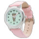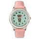 Een kinderhorloge met een eenvoudige cartoon illustratie van een bruin beer met een gele madeliefje. Hallo op zijn hoofd geschreven.