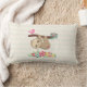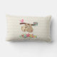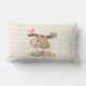 Lumbar kussen met een afbeelding van een schattige bruine sloep die ondersteboven hangt. Deze grappige kleine jongen houdt een tak vast met een roze vogel aan de ene kant van de tak en een rozenrozenroos aan de andere kant. Hieronder zie je een opstelling van kleurrijke handgetekende bloemen. Deze schattige sloth heeft ook roze rooskleurige wangen en 3 schattige kleine harten op zijn kont. De achtergrond is een pastelgeel en groen met een golvend gestreepte patroon.