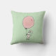 Een kussen met een grillig konijntje met een grote roze ballon die in de lucht zweeft. Zet op een lichtgroene achtergrond.