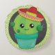 Een rond kussen met een leuke illustratie van een groene cactus die in een bloempot zit. Grote kawaii ogen en een rode sombrero dragen. De achtergrond is een patroon met lindegroene wervelingen.