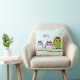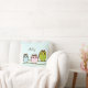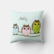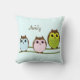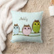 Cute child's slaapslaapkamer accentussen kussen gedaan op een lichtblauwe achtergrond. De afbeelding van de cartoon is blauw en bruin, roze en bruin en een groene en bruine uil die op groene takken zit, versiert de voor- en achterkant van de kussen. Pas de witte bruine tekst aan voor de kamer van je kind.