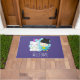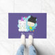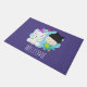 Een welkome deurmat met een grillig afbeelding van een eenhoorn en vogel. Dit paar glimlacht vrolijk terwijl ze samen rondhangen. Een klein hart zweeft boven hun hoofd. Eenhoorn is wit met engelenvleugels en een roze hoorn. De vogel is groenblauw van kleur en draagt een zwarte toque met zwarte poesje met oren. Een blauwe wolk geplaatst achter deze gelukkige beste vrienden.