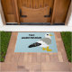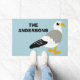 Deze gepersonaliseerde deurmat of welkomstmat is voorzien van een leuke cartoon-stijlillustratie van een meeuw tegen een lichtblauwe achtergrond met jouw naam of andere tekst in vetgedrukte zwarte letters.