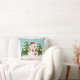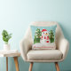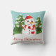 Deze feestelijke kussen zijn voorzien van Destei's cartoon illustratie van een schattige sneeuwman met een rood pet en een sjaal met rode en witte strepen. Deze sneeuwman heeft een wortel voor een neus en bruine stokken als armen. De sneeuwman glimlacht ook. Achter de sneeuwman zitten twee vuurbomen met een sneeuw op hen. De achtergrondkleur is blauwgroen met een dalend sneeuwpatroon. Onder de sneeuwman staat "Kerst mooi!", samen met een aanpasbaar tekstgebied voor een naam.
