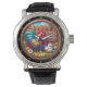 This vibrant clock features a colorful rooster and a small white chick standing in a garden of pink flowers, in front of a wooden fence. A sign reads "CUTE CHICK AND AN OLD ROOSTER LIVE HERE." The bright, cheerful design makes it a charming piece for any home.