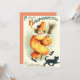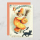 Geef een traktatie naast je truc deze Halloween. Deze afdruk toont een schattige kleine clown met een glimlachende hefboom op de lantaarn, een bezem in de hand en een zwarte kat op de voeten.