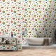 Naadloos patroon met leuke illustraties van Japans eten en fastfood met ramen, sushi, burger, frietjes, bubbelthee, kersen- en aardbeienfruit, kaastaart, met kleine hartjes voor een vrijgezellenfeest of verjaardagsfeestdecor, voor kind- en tienerslaapkamer, slaapzaal, keuken, accentmuur in een restaurant, diner, café enz. De achtergrond is in ivoorwit.