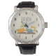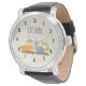 Een horloge met een schattig design met vier dinosaurussen. Twee vliegen en twee op de grond. Creëer met waterverven.