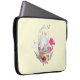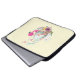 Laptophoes met een schattig schilderij van een bleek groen ei dat in een mandje zit. Gedemoreerd met linten, bogen, bloemen en weinig hart. Een roze flamingo en een wit konijnenkonijn aan de zijkant. bleke gele achtergrond.