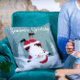 Dit sneeuwontwerp heeft een schattige kerstman die ondersteboven hangt in een touwtje of kerstboomlichten met vakantie dat op de achtergrond valt. Hierboven staat de tekst "Season's Greeting" in de moderne typografie. #christmas #feestdagen #seasonal #festive #winter #santa #santaclaus #saintnicholas #snow #snowflakes #whimsical #decor #cute #modern #fun #cushion #throwpillow #kussens #home #homedecor #christmasdecor
