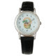 Een horloge met een schattige illustratie met een glimlachende groene en gouden pot met een schattige regenboog, een gelukkige wolk en een groene klaver.