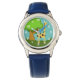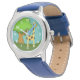 Kleurrijke giraffe-kunst op het horloge van het kind met lederen riem, verkrijgbaar in verschillende kleuren voor jongens of meisjes.