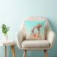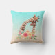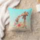 Een kussen met een leuke tekening in waterverven van een moeder en baby giraffe. De moeder giraffe rust haar hoofd op de top van de baby giraffe, liefdevol en schattig. roze, geel, groen waterverf bloemboeket geplaatst onder dit lieve paar. Een verloopachtergrond die is gemaakt met een delicate turquoise blauwe kleur die overgaat in een zanderige bruine kleur.