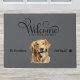 Deze Golden Retriever hondendeurmat is het perfecte cadeau voor elk hondenliefhebber. Dit ontwerp is compleet met de woorden "Welkom bij ons thuis", een plek om jouw naam en de naam van uw hond toe te voegen, en een schattige Golden Retriever waterverf-afbeelding. Geniet ervan!
