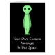 Een afbeelding van een gelukkig buitenaards karakter, deze buitenaardse is groen met grote zwarte ogen.