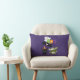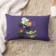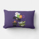 Een kussen met een zwarte vliegende vleermuis, een groene mummievleermuis met wit verband en een schattige zwarte poes met een oranje heksen pet. Boo geschreven in leuke kleurrijke letters met een vrolijke geest die erachter zweeft. Donkere paarse achtergrond.