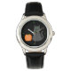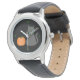 Dit geweldige horloge heeft een digitaal kunstmatig afbeelding van een schattige grijze kat met zwarte oren, neus en mond en heldere groene ogen. De kat draagt een groene kraag met een helder glanzend oranje gemstone-charme in goud. De kat zit naast een oranje pompoen.